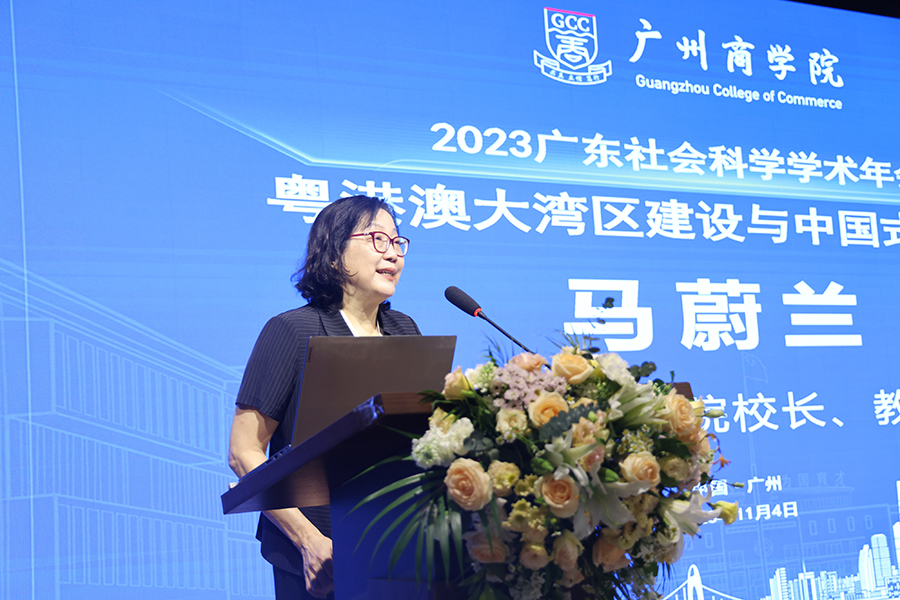 学校校长马蔚兰教授在开幕致辞中简要介绍了我校的基本情况及办学成果。她表示,建设粤港澳大湾区是习近平总书记亲自谋划、亲自部署、亲自推动的重大国家战略,是推动新时代全面开放的新举措,也是推动“一国两制”事业发展的伟大实践。马蔚兰指出,我校将以承办此次会议为契机,加强探讨、凝聚共识,继续在广东省社会科学界联合会的支持和指导下,不断开拓创新,进一步活跃学术交流平台,为推进粤港澳大湾区建设与中国式现代化发展建言献策,为共同高质量建设粤港澳大湾区作出积极贡献。