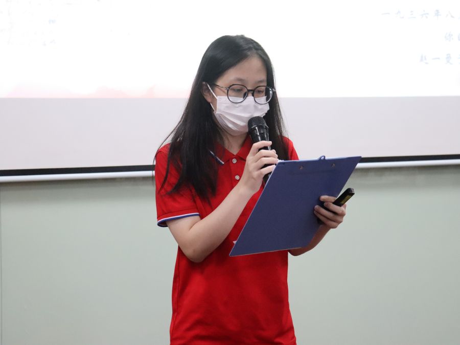 第四位朗读者,是来自2020级的张炯莹,她向我们朗读的是《陈觉与赵云霄的诀别信》。通过她的朗读,我们深入理解了“舍小家,为大家”的内涵,这一句话在陈觉与赵云霄中表现得淋漓尽致,陈觉与赵云霄在面对国家需要与家庭需要时,毅然选择了为国献身,真正体现出一名党员的责任与使命!