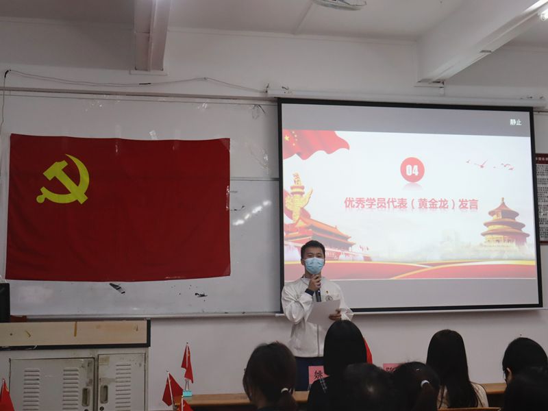紧接着优秀学员代表黄金龙结合自身在党课中的感受分享发言,他号召同学们在整个入党过程中能够严格要求自己、遵守党纪党规、服从管理;端正工作态度、富有责任感、甘于奉献;向优秀学员看齐,不断地向党组织靠拢,争做先锋模范。