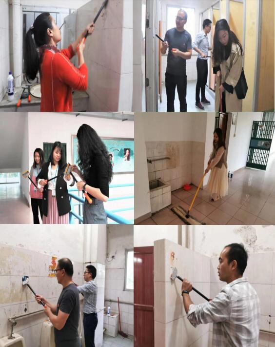 随后,林雨书记负责分发洁厕用具,各教工党员同志们和志愿者们领到工具后便开始了分工作业,洁厕行动一度热火朝天般的展开。各参与成员之间分工明确,效率较高,不同的楼层和不同的作业范围均有专人负责,小团队之间互相协作,人人干劲十足,洁厕效果一目了然。