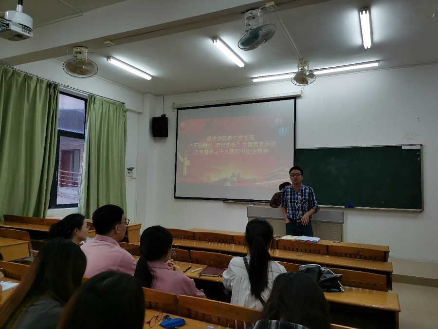 这次党课学习由suncitygroup太阳集团教工党支部书记林雨同志负责讲授,学习的内容是“不忘初心、牢记使命”主题教育之学习中国共产党第十九届中央委员会第四次全会精神。林雨书记指出,担任支部书记以来的第一次党课,一定要对标“初心”这一主题,高校教职工的初心是教书育人,为国家和社会培育人才,身上肩负的责任不可谓不重,因此教工党员除了要以高度的担当意识做好表率工作,更要以共产党员敏锐的洞察力保持先进性,适应新时代的潮流,做到与时俱进,因此他指出有必要集中学习党的十九届四中全会精神。