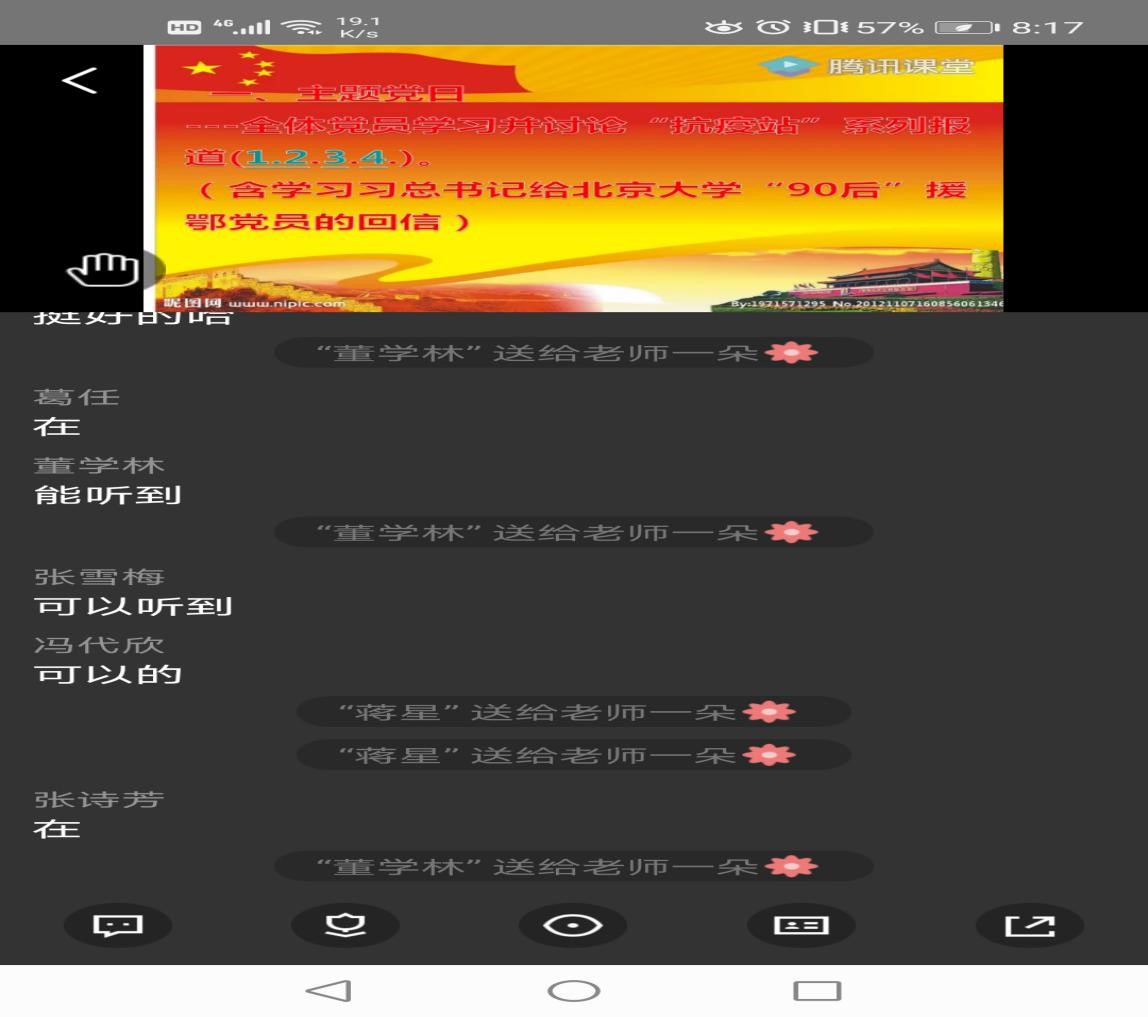 随后,林雨同志对此次会议进行了总结,他表示,党组织线上开展组织生活的形式非常新颖,也是在特殊时期广大党员同志应该积极参与支部活动的有效途径,此外,他还勉励各教工党员老师在防疫期间,要不忘教学初心,牢记育人使命,团结一心,积极备课,在线上授课过程中要加强爱国主义教育和专业教育,传递正能量,为祖国的防疫抗疫战贡献力所能及的力量。