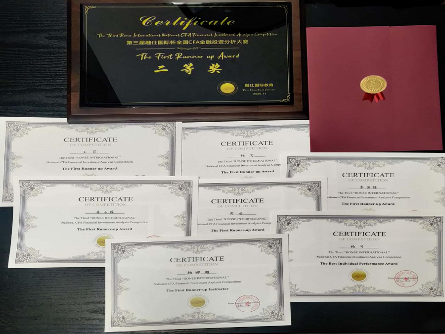 为全面提高CFA项目班专业人才培养质量,激发学生对金融投资分析的兴趣,突出国际化和实战化的培养特点,在连续参加前两届融仕国际杯全国金融投资分析大赛的基础上,我校2018CFA班学生于2020年11月7日参加了第三届融仕国际杯全国CFA金融投资分析大赛并取得优异成绩。