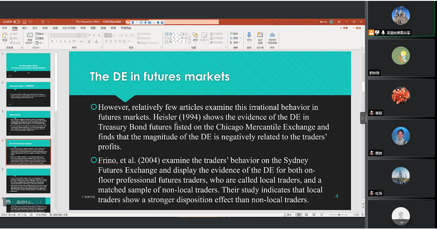 吴昱博士分享的的主题为中国指数期货市场的处置效应。研究采用Choe和Eom(2009)中使用的方法来研究沪深300指数期货市场的处置效应。处置效应是指投资者愿意持有亏损的股票,出售盈利股票的倾向。使用一个包括一家经纪公司在一段时间内所有账户的详细交易信息独特的数据库,发现了指数期货市场存在处置效应的证据,并对投资者特征对处置效应的影响进行了分析。