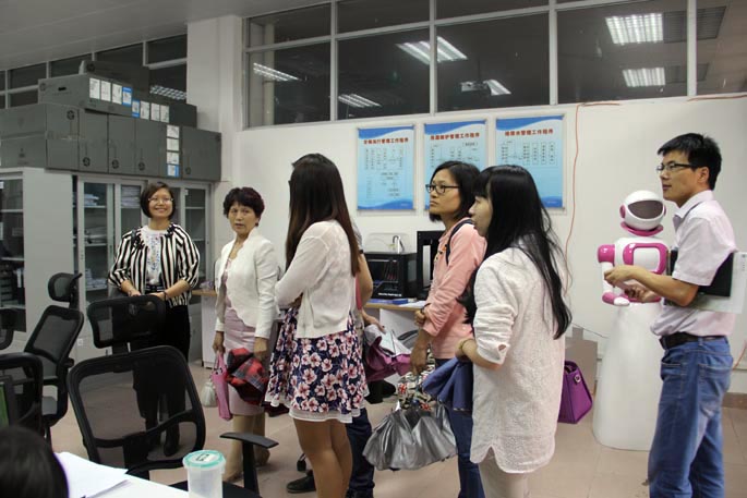 会后,在白丽的陪同下,广东财经大学华商学院一行参观了“菜鸟驿站”、“校园E银行”、“赛凯产品设计工作室”。