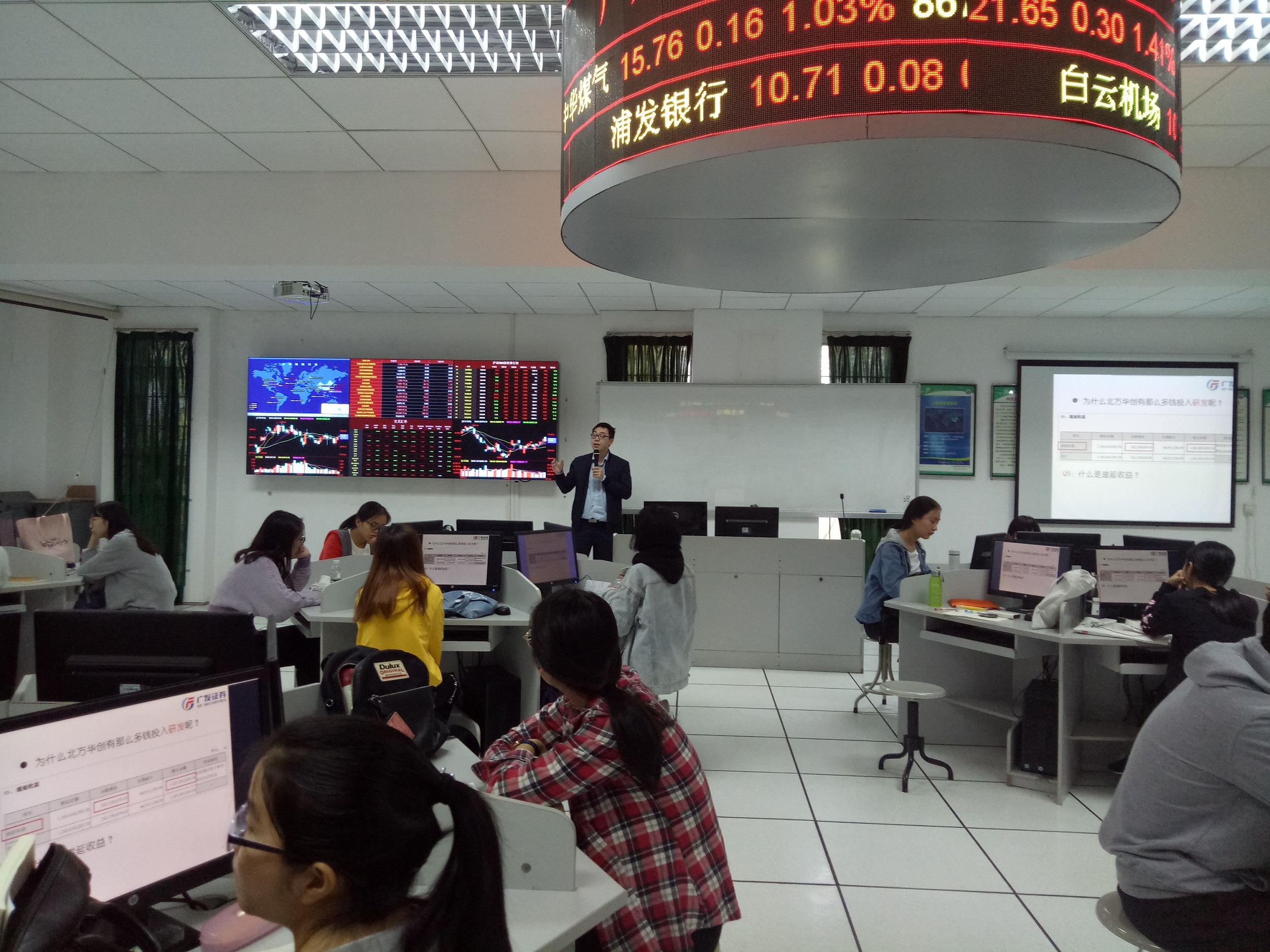 为了进一步提升金融学院学生证券投资分析能力,更好地将书本知识和实际经济活动联系起来,金融学院邀请到校企合作单位之一——广发证券广州花城大道营业部的首席投资顾问邵嘉铭经理给我院学生授课,邵经理分别在11月16日、11月23日以及11月30日连续三个周五的下午给学生上课,共12个课时,受益学生为16级金融学六个班三百多个学生。