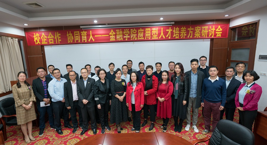 为了提升学院金融类专业人才培养质量、促使学院培养的人才更适合企业的应用要求,2018年11月22日下午,金融学院在第二行政楼208室举行了金融学院应用型人才培养方案研讨会。出席本次研讨会的有金融界专家学者、企业代表以及学校领导,他们分别是,广州大学博士生导师、经济与统计学院MPAcc中心主任胡志勇教授,广东外语外贸大学金融学院院长、博导易行健教授,汕头大学杜沔教授,广州互联网金融协会方颂会长,合富金融策略发展部总监徐北,深圳大讯科技有限公司董事长杨勇,平安人寿高级主管杨娇,华粤金服科技有限公司董事长钟明,广发证券高级经理邵嘉铭,广州好期者教育咨询有限公司总经理石幸幸、经理罗智鸿,中国建行广州开发区机构部经理赵晖,中国建设银行广州中新知识城支行行长胡育平,中国建设银行中新知识城支行运营主管廖灿军,广州农商银行太阳金融资产管理业务中心副总裁熊剑庆,艺助创投资本董事长阳立明,北京恒昌汇财投资管理有限公司翟妍芳经理,广东坤熙基金管理有限公司总经理肖建喜,广州商学院常务副校长孙云教授,副校长刘根正、欧洁梅,教务处处长彭娟,评建与监督办主任邬家炜。兄弟学院教师代表和金融学院各教研室主任及教师代表等参加了此次研讨会。