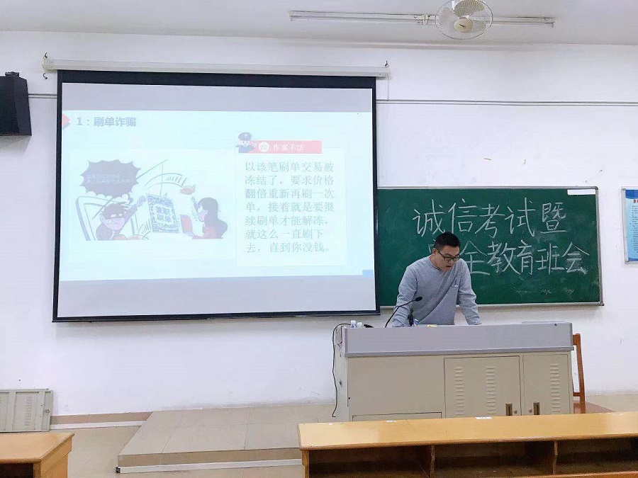 最后,班长刘思乐进行了防诈骗知识的宣传,播放了防诈骗知识相关的PPT,并举例了近期个别学生被骗的案例,让同学们通过真实的事件,增强自身的防骗意识,再次提醒同学们要提高安全意识。