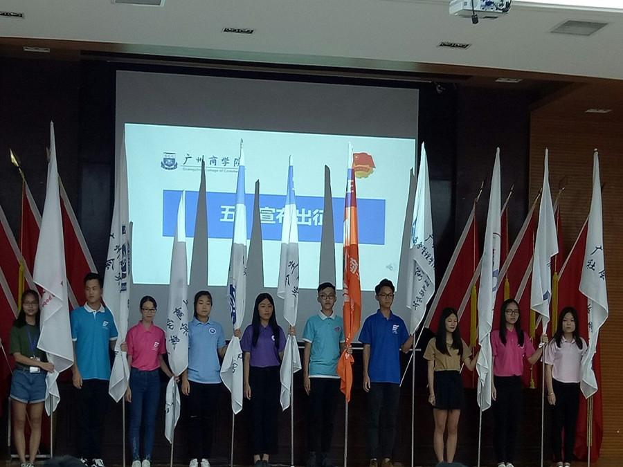 为了更好的鼓舞志愿者的士气,让各实践队伍响应号召,发挥当代大学生的先锋模范作用,由校团委举办的“广州商学院2017年暑期“三下乡”社会实践活动出征仪式于2017年7月7日15:00在在第一报告厅举行,出席本次活动的有校党委书记吕泉荣、校党委副书记何柏略、校团委书记李锦堂、校团委副书记翁楚歆、黄莉霞、曾国富、各二级学院团委书记、各二级学院学生会指导老师以及各实践队的代表等。其中,我院“三下乡”指导老师陈敬宗带领金融学院青春逐梦服务队参加此次出征授旗仪式。