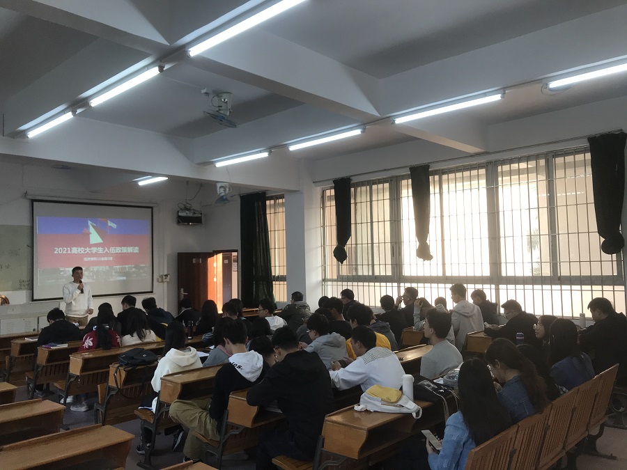 在主题教育班会活动上,设置了政策解读、观看征兵宣传片、退役军人分享、现场答疑等环节。2018级辅导员及班级团支书向同学们宣读大学生入伍的相关政策,详细讲解了大学生应征入伍政策规定、入伍的一般流程以及选用培养、优待政策、就业服务等相关内容,让同学们充分了解征兵入伍相关文件,动员适龄大学生积极应征入伍。同时,通过播放征兵宣传片、征兵公益宣传片《逐梦青春》、《参军报国 不负韶华》,在征兵宣传的主题班会上辅导员和团支书就同学们提出的征兵相关问题作了详细解答,鼓励同学们踊跃报名参军,报效祖国。
