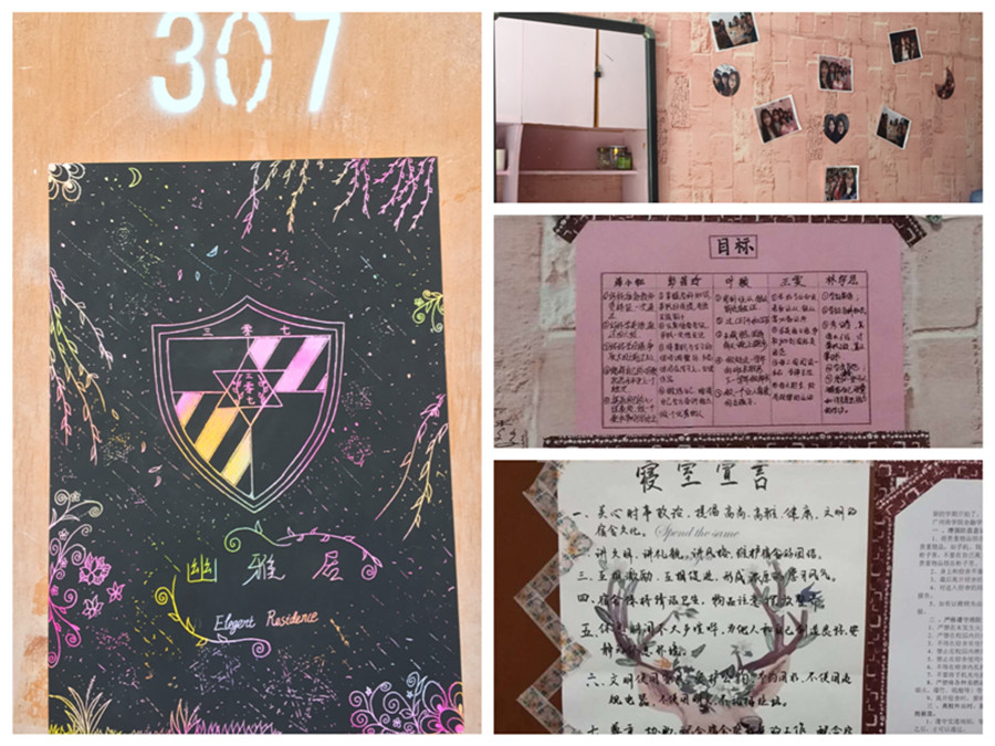 金融学院17级金融7班公寓12栋307舍,在我校严格的卫生宿舍评比中脱颖而出,并在领导的支持下以该宿舍为模板打造校级卫生样板间。此次观摩,深获学生处领导及各学院党总支书记认同,并获得相应表彰。明之尚美,馨德亦缘。307室的同学们秉持此道,规范自我,提倡勤俭节约,并将其落至实处。在班长及宿舍长的带领下,成员们力争上游,互相督促,发奋图强,平均绩点高达3.5。与此同时,该宿舍成员和睦相处,互帮互助,打造了属于其自身的宿舍文化,比如宿舍舍徽、宿舍公约、寝室宣言、目标墙、照片墙等等,营造了温馨和谐的生活氛围以及干净舒适的生活环境。