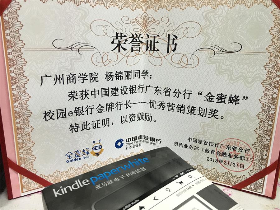 15级金融班杨锦丽同学在2018年3月“建行·金蜜蜂”校园e银行行长工作会议中荣获中国建设银行广东省分行“金蜜蜂”校园e银行金牌行长——优秀营销策划奖。