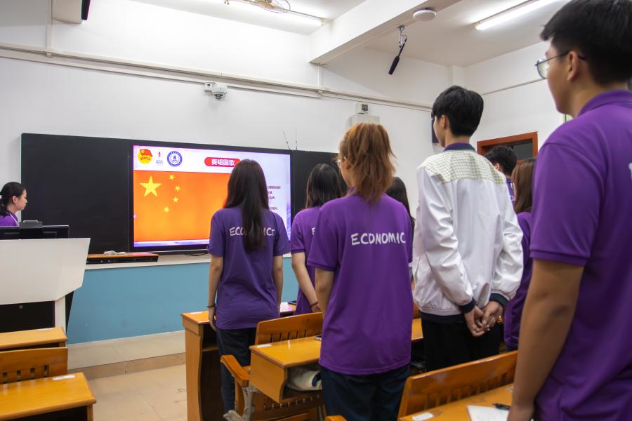 学生会全体成员肃立奏唱国歌。接着,王珍妮宣读了功能性团支部的介绍和大会的选举办法。