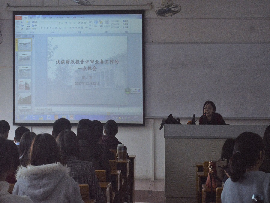 本次的授课,首先以陈大莘老师的自我介绍和工作内容介绍拉开了的帷幕,陈老师向同学们讲述了她在财政局从事的主要工作。接下来陈大莘老师讲述了一些工作感悟,她告诉同学们进入一个新的部门不是想象中那么简单,而是要通过不断地学习积累经验才能够在部门稳定下来,同时不停工作会透支身体,提醒同学们尽量要减少加班熬夜,合理安排学习时间。然后她详细介绍了作为一名评审人员应该具备哪些条件,特别强调要树立好良好的职业道德以及严格遵守劳动纪律。最后,陈大莘老师向同学们系统地介绍了相关的法律法规文件,以及给同学们分享了一些工作调动后的感悟,她说职业调动最深的感受是新岗位需要的专业知识会更强。