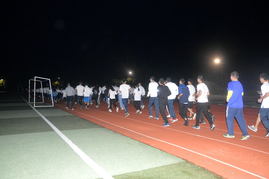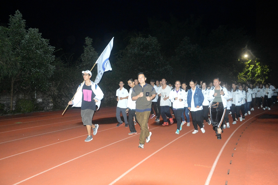 18:30时,陈敬宗老师与一名举着广州商学院金融学院院旗的同学带领着全体学生开启长跑之旅。在跑道上,我院学子充满激情,精神饱满,排着整齐的队伍向前奔跑,展现了金融学子在操场上的运动风采。虽然夜色降临,气温渐降,但是经过半个小时的长跑,同学们仍然精神奕奕,笑容不断。