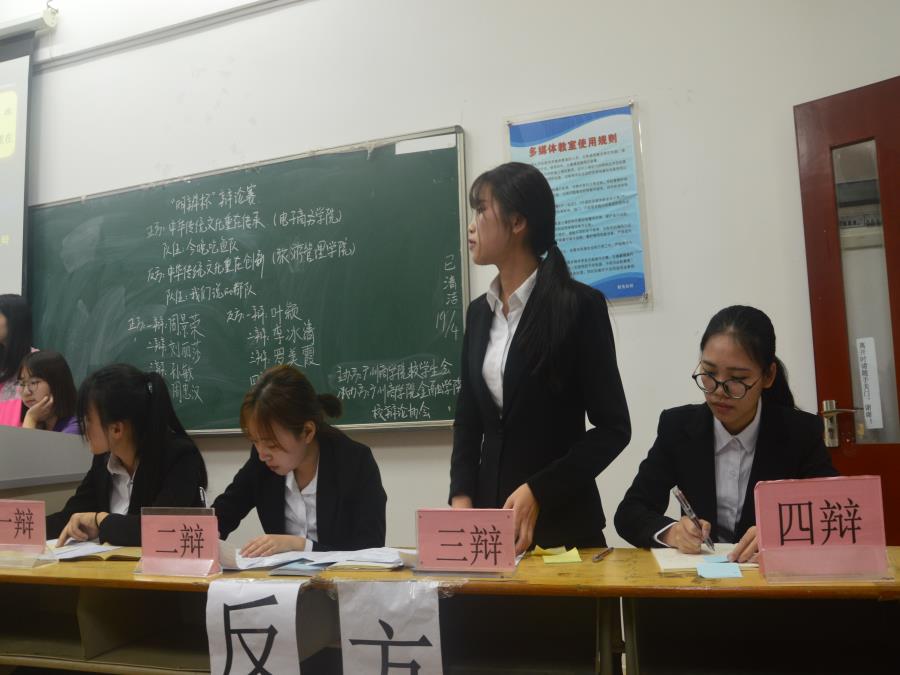 主席宣布开场后,辩论赛初赛第七场正式开始。正方来自电子商务学院——“今晚吃鱼队”——周景荣,刘丽莎,孙敏,周忠汉,他们的观点是“中华传统文化重在传承”,反方来自旅游管理学院——“我们说的都队”——叶颖,李冰清,罗美霞,卢瑜,他们所持的观点是“中华传统文化重在创新”。开篇立论之后,双方进行一对一攻辩,在这一环节,双方三辩和四辩都提出了尖锐的问题,比赛的气氛渐渐升温,场下的观众也在不停的用掌声来为辩手们鼓劲加油。经过了四轮问答之后,正反双方的四辩针对对方辩友的漏洞和不足进行攻辩小结。最激烈的还要数自由辩论环节,辩手们引经据典、旁征博引,运用大量的理论依据,赢得台下观众们的阵阵掌声和欢呼声。最后,恭喜旅游管理学院——“我们说的都队”取得胜利。