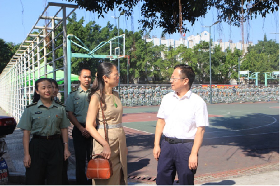党总支书记张雪梅向黄弢校长讲述了军训期间的工作安排和后续工作,表示全体政工全力协助教官做好新生军训工作,为广州商学院培养有纪律,有素质,有气魄,有担当的新时代新青年,全力以赴给新生们上好他们大学的第一课。
