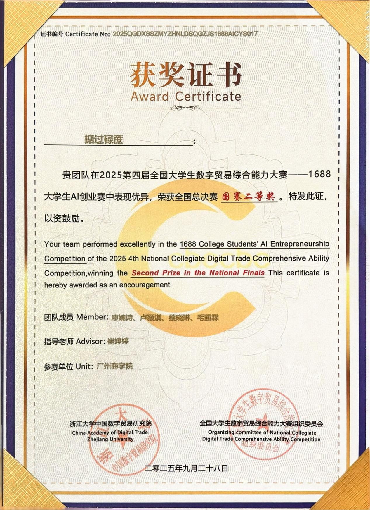 大赛涵盖了数字贸易的多个方面,要求参赛队伍具备扎实的专业知识、创新思维和团队协作能力。此次比赛赛道分为:1688大学生AI创业赛道、义务小商品城AI+创新创业赛道、尼奥尼跨境直播赛道和丝路电商来华留学生案例赛道四个赛道。其中我院学子参加的1688大学生AI创业赛道共有来自全国29个省、自治区和直辖市的240所高等院校1198支队伍参赛,最后有91所高校队伍最终参与总决赛比拼。广州商学院suncitygroup太阳集团指导教师崔婷婷老师带领一支队伍“掂过碌蔗”(团队成员:廖婉诗、卢颍淇、蔡晓琳、毛凯霖)成功晋级总决赛,经过多轮比拼,最终荣获总决赛二等奖。