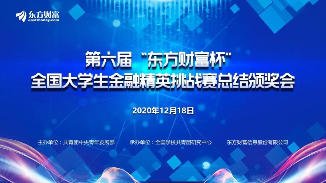 12月18日,由共青团中央青年发展部主办,东方财富信息股份有限公司、全国学校共青团研究中心承办的第六届“东方财富杯”全国大学生金融精英挑战赛线上总结颁奖会成功举办。我校学子获得:全国一等奖2支队伍、全国二等奖13支队伍、全国三等奖12支队伍。