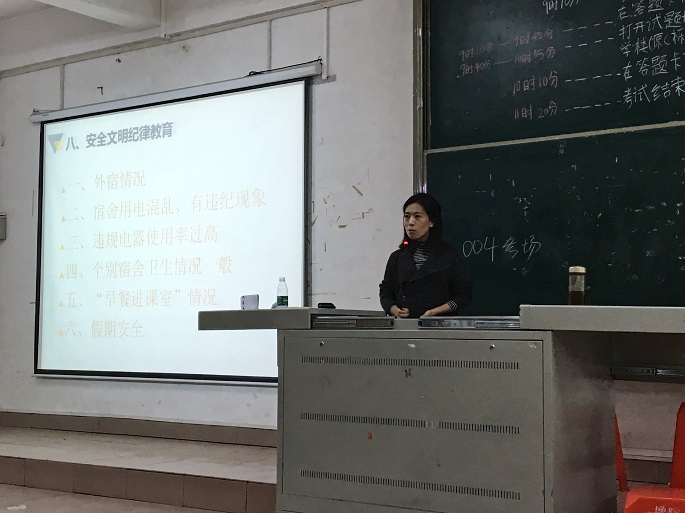 在本次总结会议上,范英琦老师着重强调了安全的重要性,从外宿情况以及宿舍违规电器使用状况以及假期安全等方面进行了说明,强调同学们不要忽视安全问题,希望同学们配合学校以及各学生组织的工作,把安全放在第一位。会议的最后,范英琦老师向学生们强调了期末考试注意事项,考试纪律以及考试时间,鼓励同学们要考出自我、考出真实的水平,不弄虚作假。
