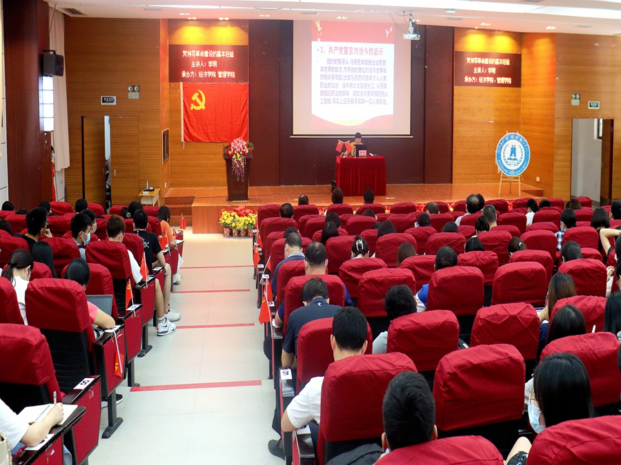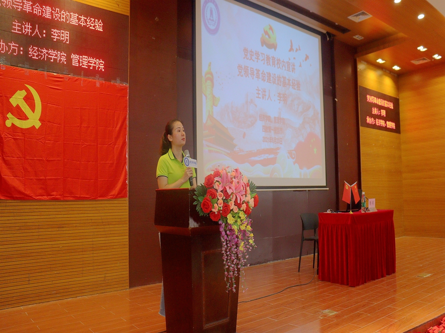 2021年是实施“十四五”规划、开启全面建设社会主义现代化国家新征程的第一年,更是中国共产党成立100周年,为了贯彻落实习近平总书记在党史学习教育动员大会上的讲话精神,更好地了解党的发展历程,扎实推动党史学习教育,校党委理论学习讲师团对各学院进行党史学习教育巡回宣讲。suncitygroup太阳集团、管理学院承办的首场报告会于5月20日下午在四教第一报告厅开展,本次《党领导革命建设的基本经验》的专题报告会特邀马克思主义学院李明副教授授课。出席本次会议的有suncitygroup太阳集团党总支书记张雪梅,管理学院党总支书记汪椿东、管理学院教学副院长白丽,管理学院和suncitygroup太阳集团的师生代表共计320人。本次会议由张雪梅书记主持。