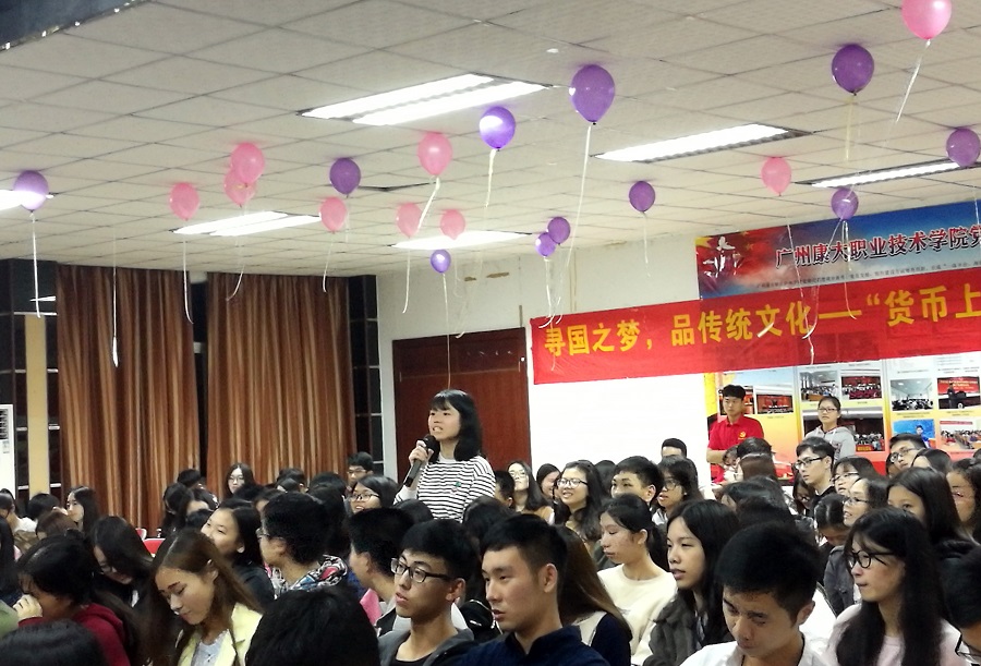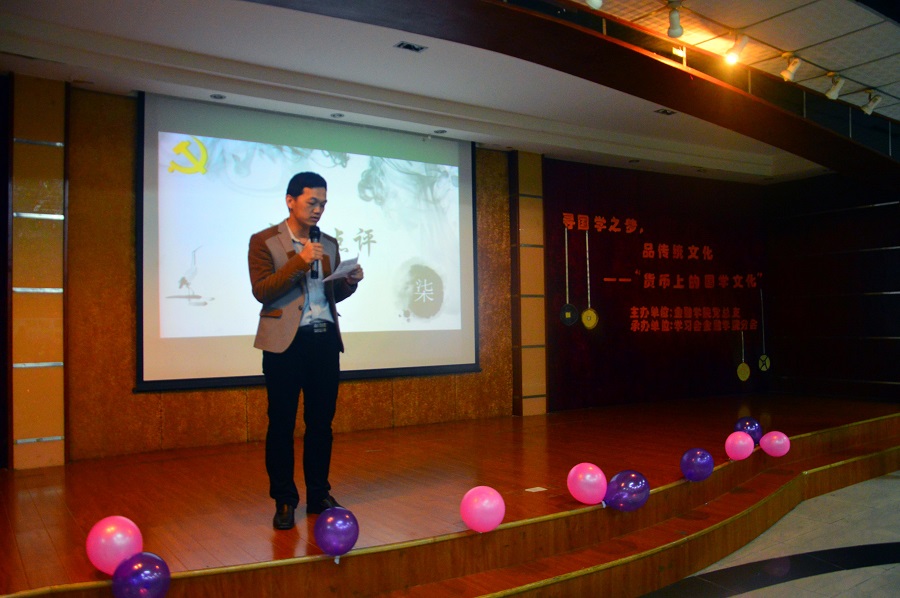 为把货币与传统文化连接起来,让货币上的国学文化走进我们的生活,学习会金融学院分会于2017年4月12日晚19:30在康大歌舞厅举办了以“寻国学之梦,品传统文化”为主题的货币上的国学文化活动,出席此次活动有金融学院党总支书记张雪梅,学习会金融学院分会指导老师陈敬宗,金融学院16级辅导员叶剑敏、谢洁,校、院分会理事长及学习部部长。