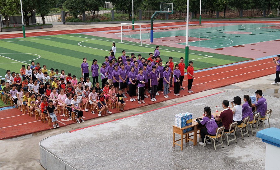 青空万里,展翅在即。2019年7月8日上午八点三十分,杨子坑小学和我院“青春逐梦服务队”一同于校园操场举办了开班仪式。出席本次开班仪式的有杨子坑小学陈瑞妹副校长、广州商学院suncitygroup太阳集团何锡智老师、林彦君老师、“三下乡”全体队员和杨子坑小学全体同学。