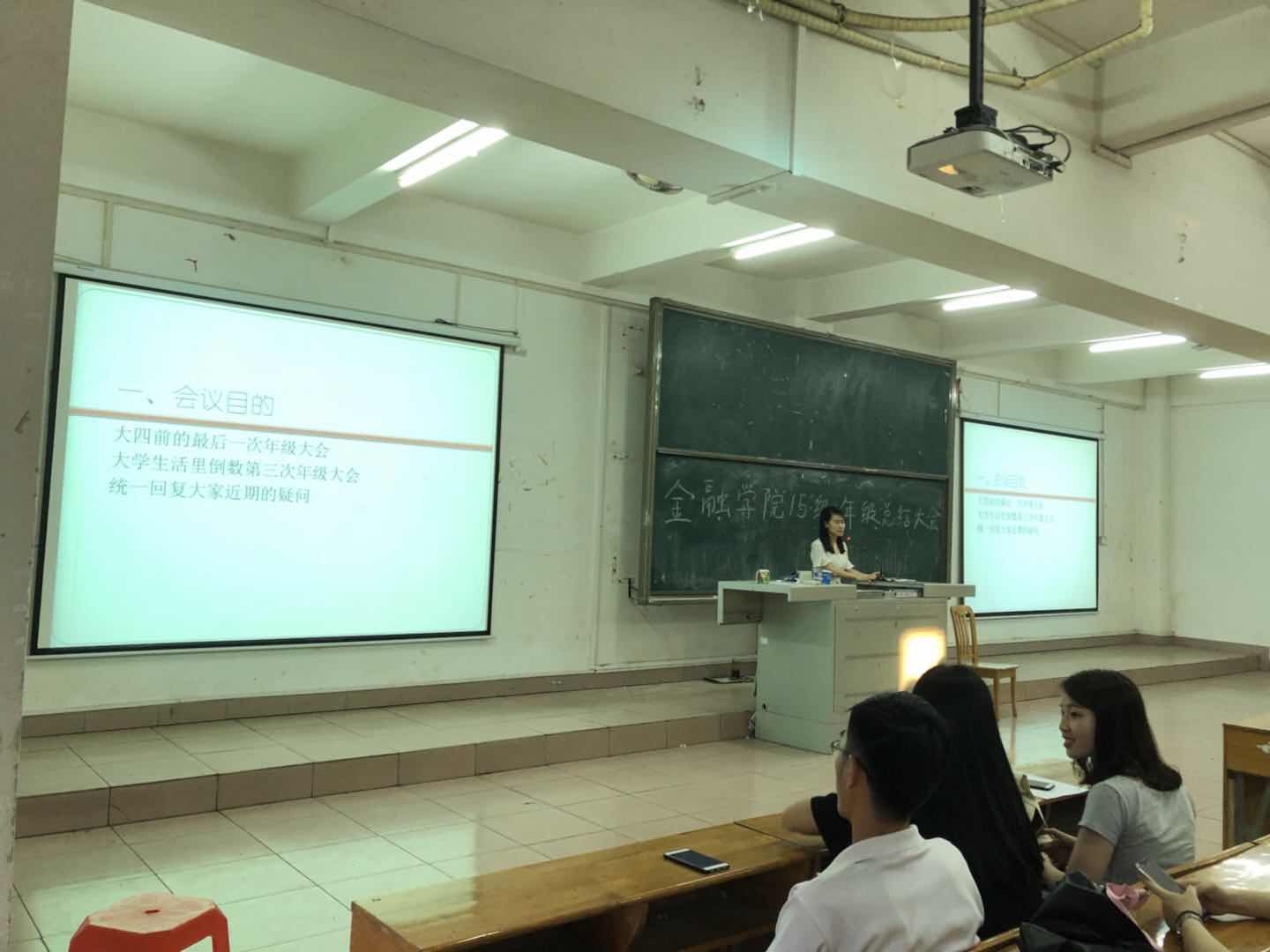 为了对本学期以来学习、工作、生活等各个方面进行总结和对即将进入大四生活预备,金融学院2015级于2018年6月26日晚上7点在一教111举办年级总结大会, 15级辅导员吴茜茜老师和金融学院15级全体学生出席了本次会议。