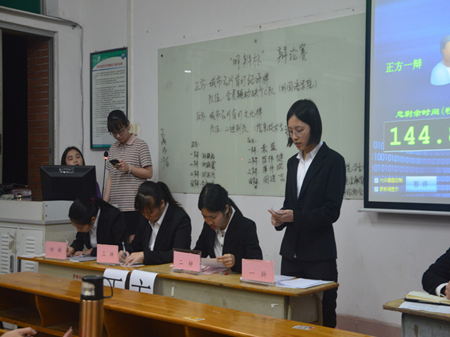 伴随着主持人的开场,辩论赛初赛正式拉开帷幕。正方是来自外国语学院——“全员辅助缺个C队”——孙颖怡、刘晓霞、刘冰冰、李智君四名辩手,其支持观点为“城市名片打造经济牌”。反方是来自信息技术与工程学院的——“二进制队”——袁盛、陈伟健、廖仲斌、周建吉四名辩手,其支持观点为“城市名片打造文化牌”。两队展开了激烈的角逐,辩手们配合默契、妙语连珠,现场掌声连连。紧接着在质询环节中,双方辩手从容应对,旁征博引。而后在总结陈词环节中,信息技术与工程学院双方辩手针对对手逻辑上的漏洞逐一回击,思路清晰,引经据典,才思敏捷。比赛最后,三位评委对整场比赛做出了精彩的点评,进一步深化了此次辩论赛的辩论主题,对辩手的表现给予肯定,同时也指出外国语学院和信息技术与工程学院正反双方有待改进的地方。经过将近一个小时的激烈角逐,来自信息技术与工程学院——“二进制队”最终赢得了比赛。