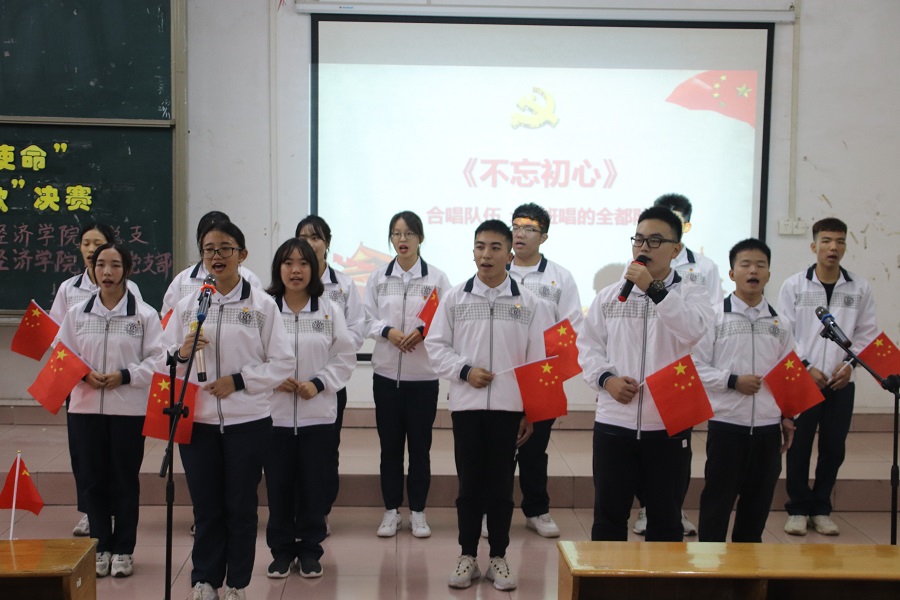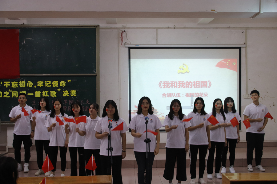 张雪梅书记在致辞中号召全体学生树立远大理想,不忘初心,牢记使命,保持爱国热忱,努力实现中国梦。本次比赛通过学生团支部与党支部红歌合唱比赛的形式,以音色与音准、演唱效果、特色编排、舞台表现、综合表现等五大项目为评分标准,参加此次比赛的有团支部6个,党支部3个。9支队伍各展其能、各显其风采特色,用歌声唱响大学生的爱国情怀。《不忘初心》、《国家》、《我和我的祖国》、《歌唱祖国》、《大中国》、《我的中国心》等一首首耳熟能详、激动人心的歌曲在一教111教室回响,催人奋进,震撼人心。比赛以全体师生献唱《不忘初心》结束,全体师生用铿锵有力的歌声,向祖国致以最真诚的祝福,展现了最真切的爱国情怀。
