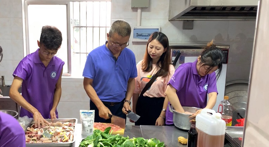 陈石清院长亲身走入厨房与正在准备食材的志愿者们交流,并在了解了志愿者的日常饮食情况后,陈院长亲自同志愿者一齐处理食材。陈院长提出,志愿者的伙食一定要有保障,使大家有充足的能量和饱满的精神开展活动。他在查看志愿者住宿环境后表示,生活环境虽较为艰苦,但作为当代青年大学生,要弘扬志愿服务精神,勇于克服困难,坚持完成所有实践任务。