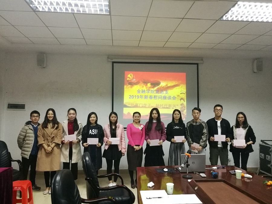2018年12月26日12:30分,金融学院党总支在二政108对各级寒门学子代表召开了2019年新春慰问座谈会,出席本次座谈会的有张雪梅书记、范英琦老师、冯羽老师,座谈会由朱文艳老师主持。