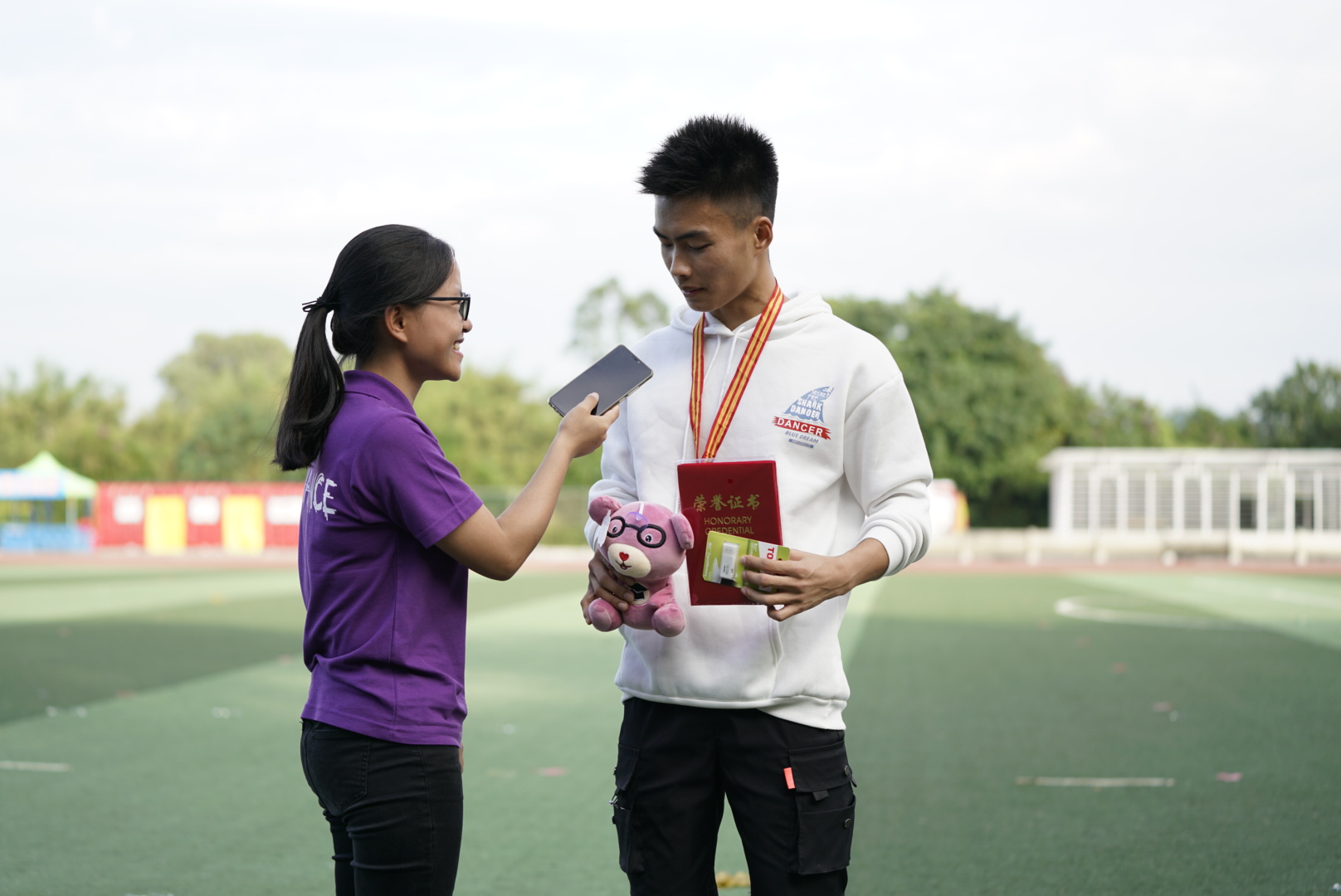 在这为期两天的校运会上,金融学院团学干部每天在天微亮的时候就到达运动会现场,伴着夕阳的落下离开运动场。在运动员比赛过程中,紫衣人的身影在运动场上奔跑,他们诚诚恳恳服务好每一个运动员,只为让运动员在赛场上能更好的发挥为金融学院争光。作为站在运动员背后的紫衣人,任劳任怨是他们的工作态度,及时给予运动员帮助和关爱,让运动员感受到金融大家庭的温暖是他们唯一的奋斗目标。每一个紫衣人工作的背影都是帅气的,每一句“谢谢,辛苦了!”便是对他们工作最好的肯定和回报。愿所有的团学干部在接下来的生活学习里,明白自身肩负的责任,在服务好金融学院与同学的同时,能够自己得到了成长,变成更好的自己!