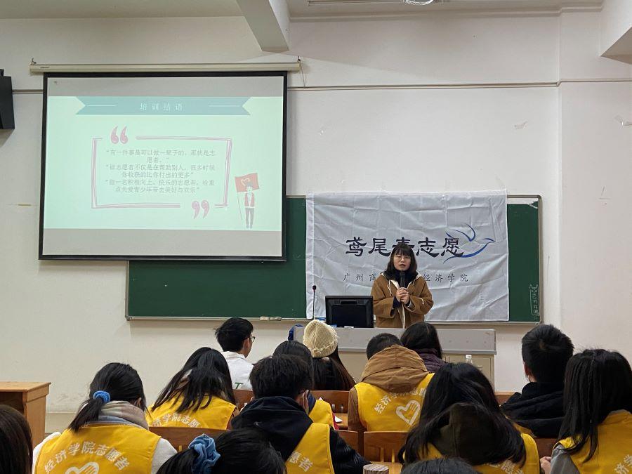 为全面提升志愿者素质,强化线上志愿服务质效,鸢尾青志愿服务队于1月10日在四教116举办了第一次专题培训会,主要针对2021年寒假线上志愿服务,出席此次会议的嘉宾有:黄埔区重点关爱青少年群体行动—黄盼主任,重点关爱青少年融入基地社工代表侯嘉宜、黄健安,鸢尾青志愿服务队指导老师刘晶,团学干部,鸢尾青线上志愿者。会议由服务队队长刘阳主持,黄盼主任主讲。