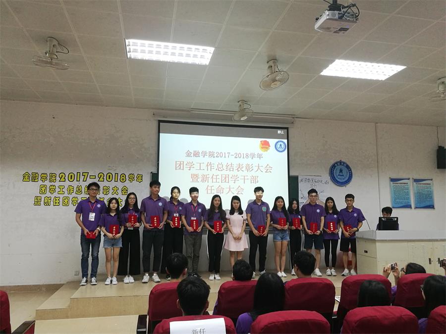 为了推动我院团学工作更好、更强、更长久的发展,保证团委和学生会在新旧成员交接后能够更快的正常运转,同时对上一年度在工作中表现突出的学生干部给予表彰,我院在2018年6月于四教第二报告厅召开了团学工作总结表彰大会暨新任团学干部任命大会。出席本次会议的有金融学院团委书记叶剑敏、金融学院学生会指导老师吴茜茜、团委学生会全体现任和新任干部。