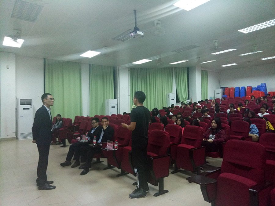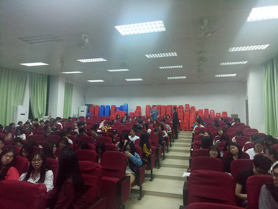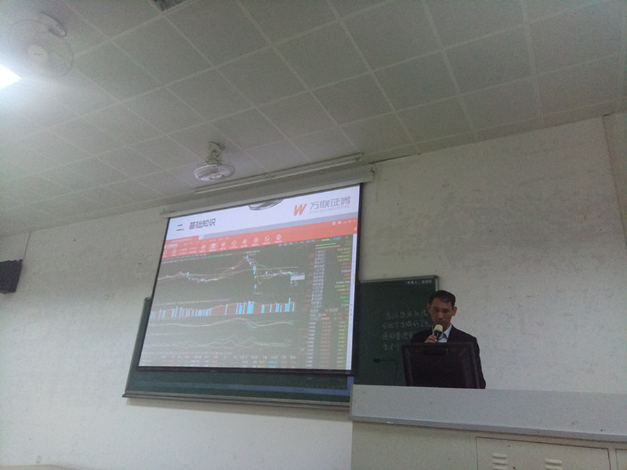 首先,主持人房金思进行了开场。紧接着,陈耀辉经理对基本股票知识进行了讲解。他结合一些股票的行情图进行分析,告诉学生进行股市买卖应该低位买入,高位卖出,传授很多买卖股票的技巧。他从学生的角度出发,提出金融学子要充分利用模拟炒股大赛积累投资经验,同时也告诉我们具体的操作流程和进阶准备。