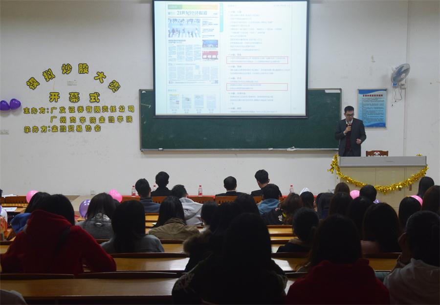 11月21号晚上19点,广发证券模拟炒股大赛开幕式在广商四教308举行。本次模拟炒股大赛由广发证券有限责任公司和广州商学院金融学院主办,由金融贸易协会承办。本次比赛旨在通过比赛拓宽同学们对股票知识面,从而培养学生对股票的兴趣,使大家主动积极去关注、了解和研究国内的财经类新闻和金融行业的发展状况,运用所学的专业知识合理投资规划,让更多的学生学有所获,学有所用。
