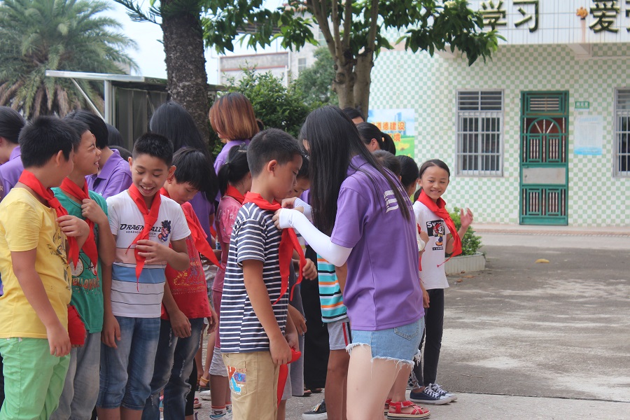 “青春共建十三五,携手共筑中国梦。”伴随国旗的缓缓升起,全体肃然起敬,开班仪式正式拉开帷幕。杨子坑村委副主任陈观添、杨子坑小学校长陈斌兴、指导老师陈敬宗先后进行了重要演讲。校长陈斌兴对青春逐梦志愿服务队全体成员给予高度肯定,并提出“两个感谢、三个希望和祝愿”,赋予青春逐梦志愿服务队高度的信任。紧接着村委副主任陈观添在致辞中表达了对青春逐梦志愿服务队的深切问候和由衷欢迎,希望青春逐梦志愿服务队能够拉近杨子坑小学学生与外界的距离,以及为村民普及金融知识。继而指导老师陈敬宗介绍了服务队相关课程内容,并承诺捐赠五十本图书及文具给杨子坑小学学生,现场气氛高涨。仪式最后,青春逐梦志愿服务队全体成员为杨子坑小学学生系上红领巾,拉进彼此距离,奠定感情基础。