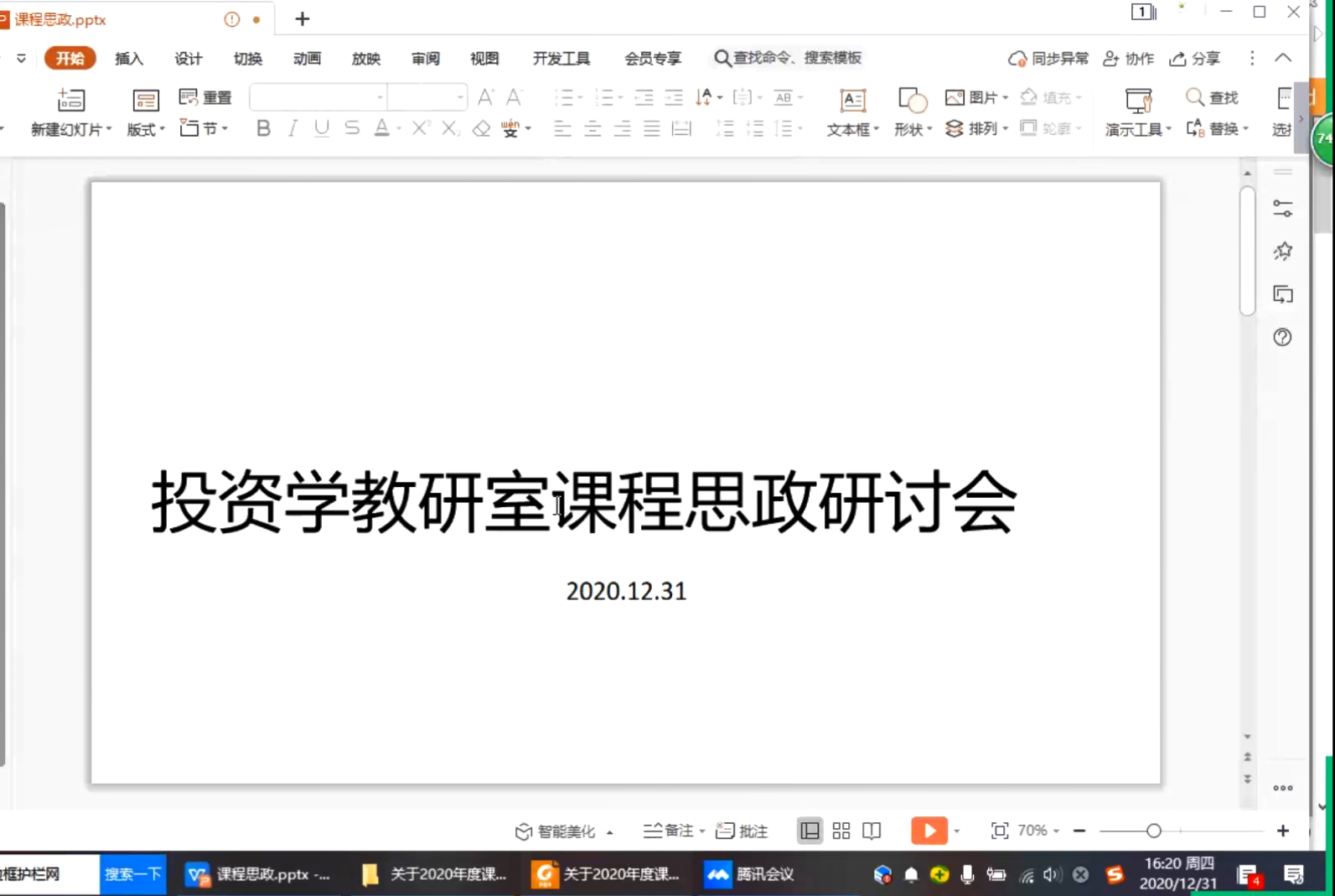 为了做好迎评促评与提高教学质量工作,同时响应《广州商学院课程思政“四个一”试点实施方案》精神。投资学教研室于12月31日召开线上学习研讨会。参加本次线上会议的有suncitygroup太阳集团陈石清院长及投资学教研室全体教师,本次会议由投资学教研室主任王姣主持。
