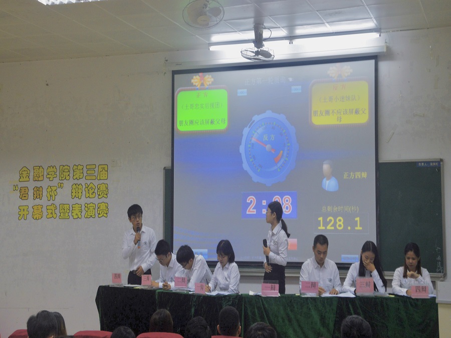 10月23日19:30在四教第二报告厅,举行了由金融学院学生会学习部主办、红领巾辩论队承办的金融学院第三届“君辩杯”辩论赛开幕式,出席本场活动的嘉宾有金融学院团委书记曾梓恒、金融学院学生会指导老师张素平、金融学院17级辅导员冯羽老师及校辩论队和各院辩论队的代表。