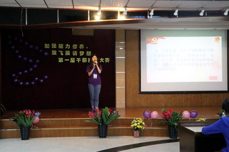 活动在主持人介绍比赛规则后正式开始,比赛分为两个环节,第一环节由参赛干部上台抽取题目进行三分钟的案例分析和描述,第二环节是干部代表进行五分钟的才艺展示。第一环节的题目类型多样,主要从学生的学习,生活,工作等各个方面着点,例如宿舍不关灯现象、校园粘贴小广告现象、课堂考勤、书香广商等等。第一环节结束,团委指导老师叶剑敏上台点评,他点评指出当前的干部积极性下降问题,要调动干部的积极性,就必须从两个方面着手,一是感情,工作中产生的友谊;二是有可学的东西,能够让干部学到知识,能够提高能力等。第二环节是干部才艺表演,才艺类型也多种多样,主要有小品、演唱、演讲、古筝弹奏、吉他弹唱等等。比赛结束,由张雪梅上台讲话。她指出学生干部是学生中的骨干和精英,是践行社会主义核心价值观的先行者,要有正确的思想、积极的态度、团队合作精神等等,最重要的是要有一颗时刻为同学们服务的心。