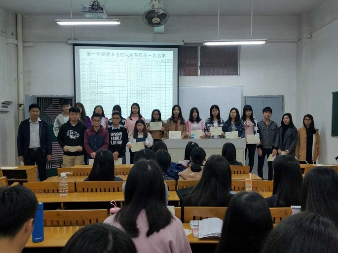 首先是级委做主持开场,赞扬了同学们上个学期认真学习的态度和热情,并且祝贺同学们取得不错的成绩。接着宣布各班前三名同学的名单,并且邀请他们上台领奖,由辅导员颁奖。
