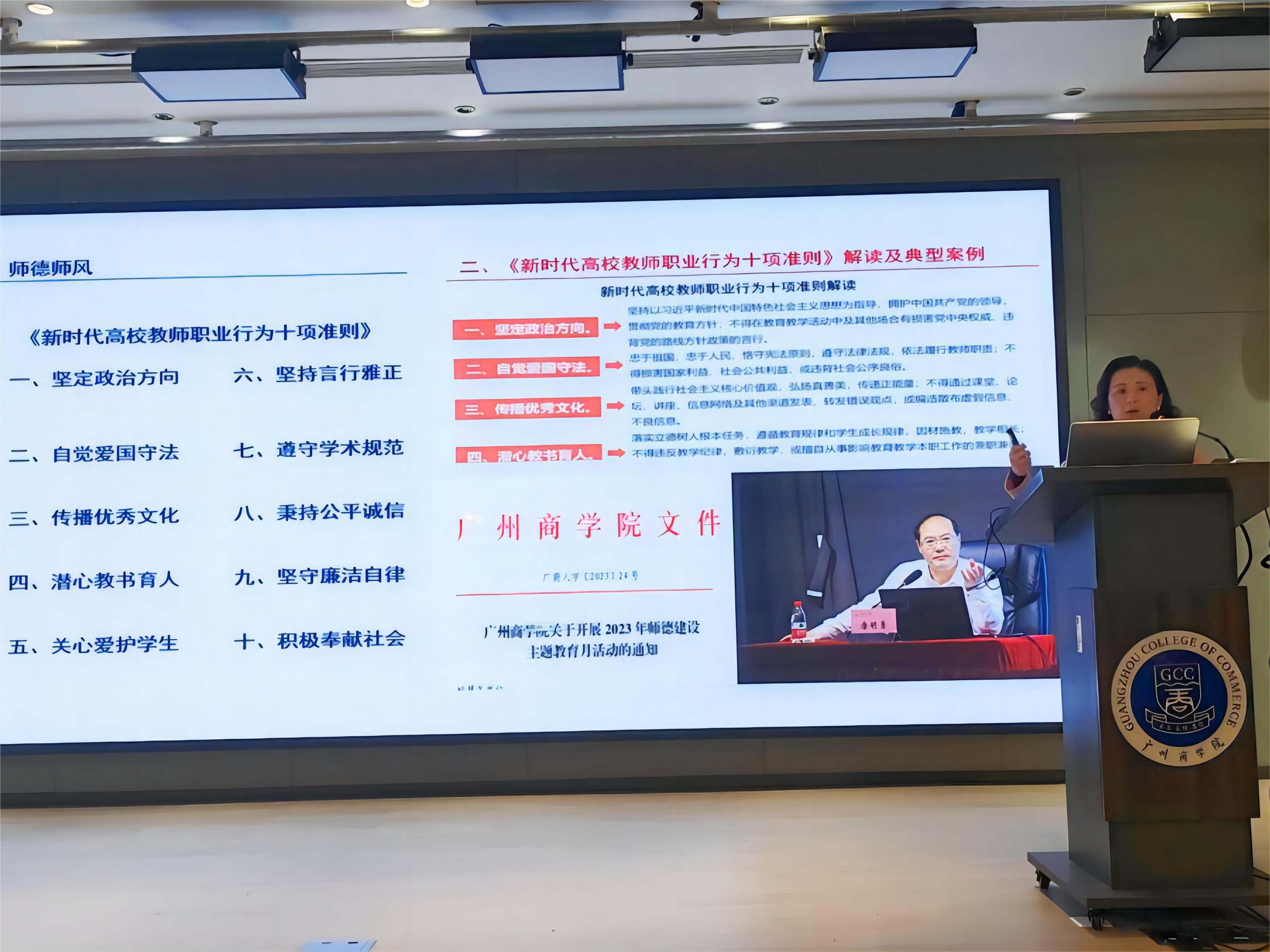 张雪梅从解读《新时代高校教师职业行为十项准则》和当前教师师德师风存在的问题方面重点阐述师德师风建设对教育教学和师生管理的重要性,引导全体教师以身作则,为人师表,塑造良好的教师队伍形象。她强调,新学期要笃行实干,把党建工作、学生安全和心理健康等工作落到实处;要提质增效,在学风建设、招生就业等方面提升学生工作质量,争取实现新突破。