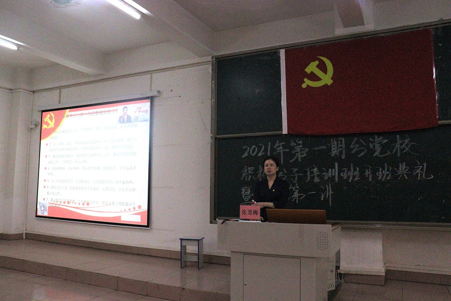 会议的最后一项议程是由张雪梅书记进行党课的第一讲——端正入党动机,坚定理想信念,以实际行动争取入党。在授课中,张雪梅书记希望学员们能够端正学习态度,强调态度决定一切,要做到不忘初心,坚定信念,明确入党动机;牢记使命,努力掌握党的基本理论知识。不仅要在思想上向党组织靠拢,更要在行动上入党。思想上要做到充实博学,在学习领悟中坚定理想信念。行动上要做好表率,在奋发有为中践行初心使命。