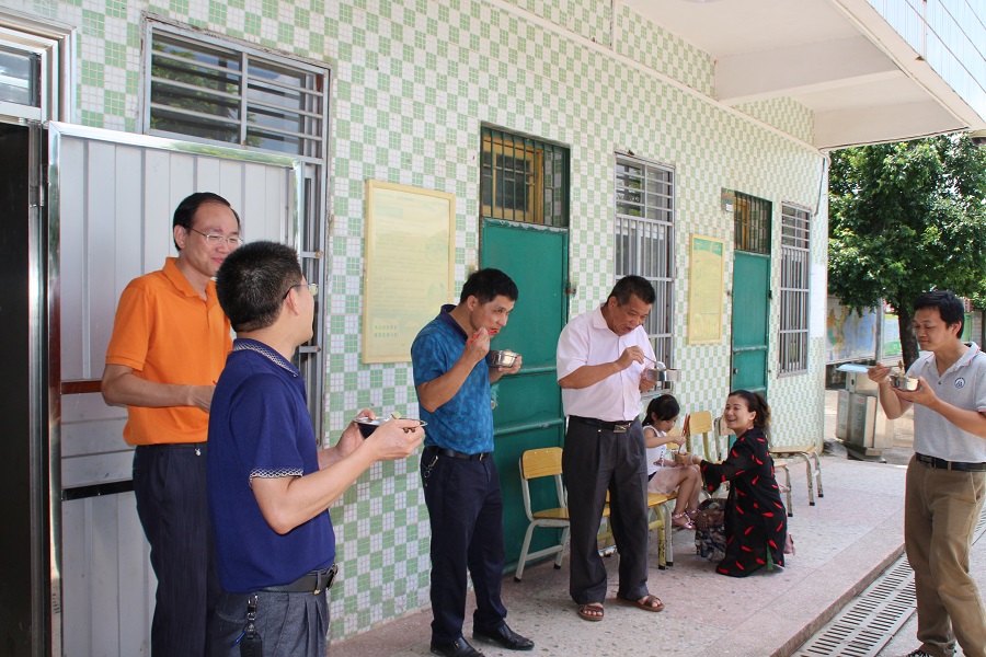 首先,李锦堂书记一行人对志愿者的饮食起居等基本情况进行了解,并且参观当天上午青春逐梦服务队举办的趣味运动会,对劳逸结合的教学方式给予高度评价与赞扬 ,此外,领导们还对此次的三下乡活动提出几点建议和要求。接下来,领导一行人为了感受志愿者的生活,与青春逐梦服务队的志愿者们一起体验站着吃午餐,平易近人的形象深深的留在志愿者们的心中。最后,我们非常荣幸邀请领导们拍照合影留念。